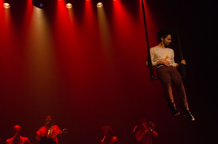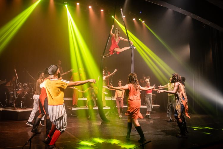 A apresentação traz o que há de belo na cena preta contemporânea afrodiaspórica, com suas vozes e corpos potentes. As coreografias transitam da capoeira ao hip hop, do balé ao Gumboot Dance, permeando o espetáculo com ritmo e acrobacia entre as cenas de trapézio, faixa, palhaçaria, tecido, malabares, contorcionismo, perna de pau e equilíbrio.